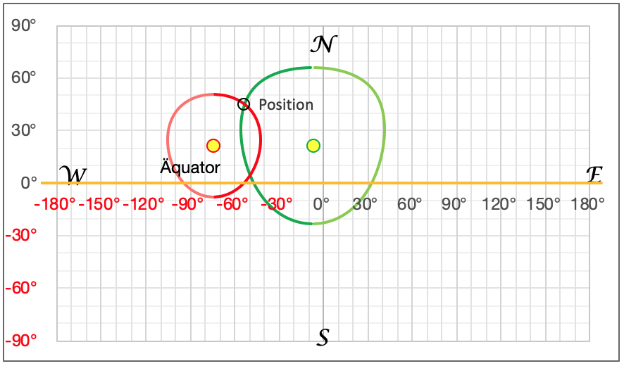 Es werden dieselben Breiten von 14° N und 15° N gewählt und es wird berechnet, auf welchen Längen diese von der Höhengleiche, die zur angegebenen Zeit mit 37,12° Höhe beobachtet wurde, geschnitten werden. Da die Beobachtung am Schiffsnachmittag erfolgte muss jetzt der Polwinkel vom Greenwichwinkel Grt2 subtrahiert werden. Es gelten jetzt:
